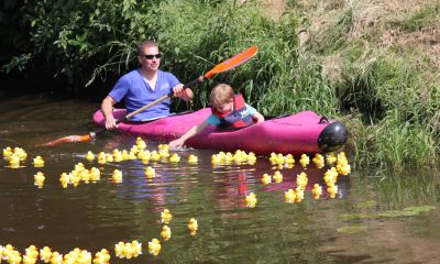 Damit die Enten sich unterwegs nicht verirren, werden sie von Mitgliedern unseres Kanuvereins begleitet. Sowohl unterwegs, wenn es gilt verirrte Enten aus der Böschung zu fischen, als auch im Ziel um beim "Finish" den Sieger festzustellen und aus dem Bach zu retten.